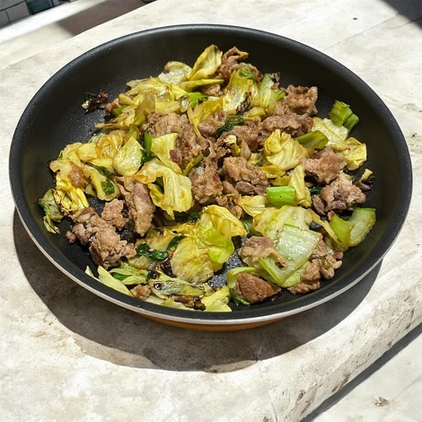 お昼は青梗菜キャベツ豚肉オイスターソース合わせ塩麹炒め
