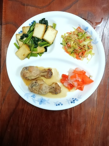 手羽元煮、小松菜・厚揚げ炒め、コールスロー、酢の物