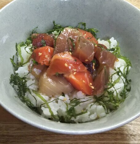 刺身の切り落としを買ってきて、漬け丼にして美味しく食べました♪(^^)