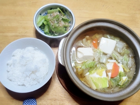ごはん、豆腐の煮物、ゆで小松菜