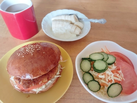 胸肉のハンバーガー、サラダ、バナナヨーグルト、コーヒー牛乳