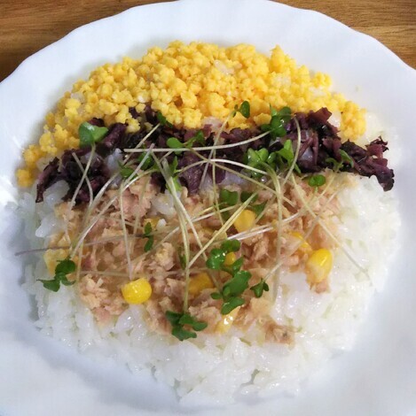 炒り卵、しば漬け、ツナコーン、ブロッコリースプラウトをのせました♪