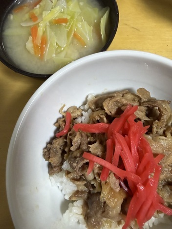 豚丼、キャベツなど野菜たっぷり味噌汁。