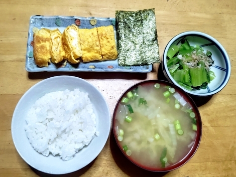 ごはん、卵焼き、味噌汁、ゆで小松菜、海苔