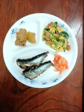 鰯の煮付け、小松菜・玉子炒め、大根・シーチキン煮、酢の物