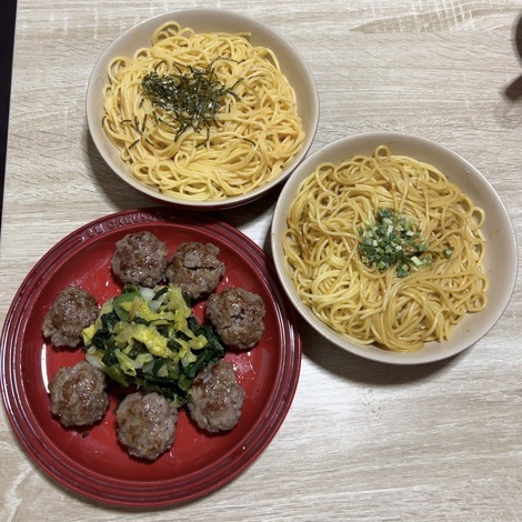 パスタ、塩麹ミニハンバーグ、かき菜白菜のごま油炒め