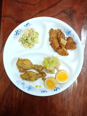 手羽元煮、揚げ物煮、サラダ、コールスロー、煮玉子