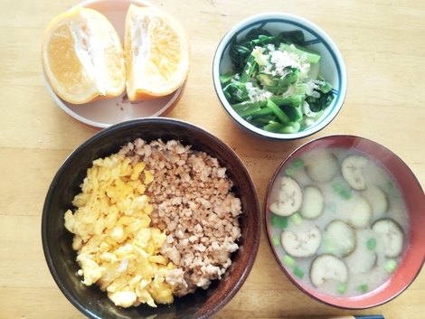 二色丼、味噌汁、ゆで小松菜、いよかん