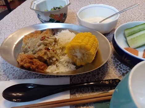 ワンプレートに、ご飯・キノコ炒め・トウモロコシでした。