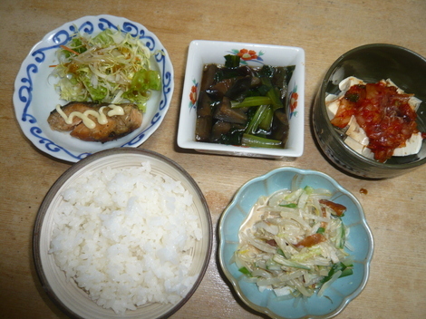 ■今日のおうちごはんは何?写真があればぜひシェアしてね!茄子小松菜煮びたし、鮭のムニエル、モヤシ胡瓜竹輪の胡麻だれかけ、キムチ豆腐、ご飯