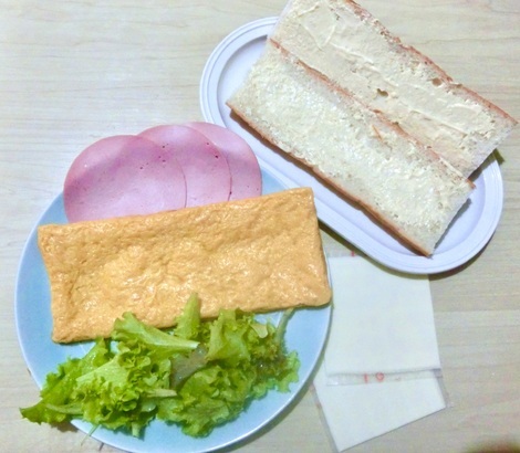 バゲットに厚焼き卵、ハム、スライスチーズ、野菜を挟んで食べました。