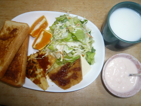 ■今日のおうちごはんは何?写真があればぜひシェアしてね!清美オレンジ、サラダ、チーズ、白身フライ、キャベツ卵焼き、トースト、ヨーグルト、牛乳