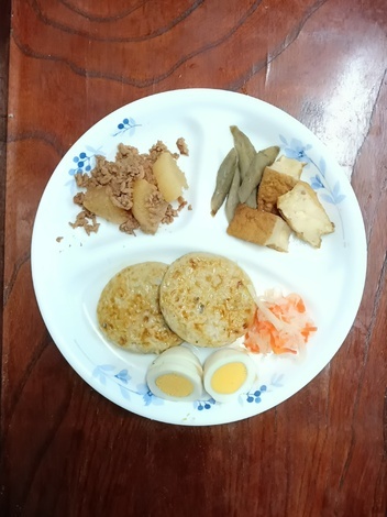 鯵ハンバーグ、大根煮、厚揚げ・ごぼう煮、ゆで玉子、酢の物