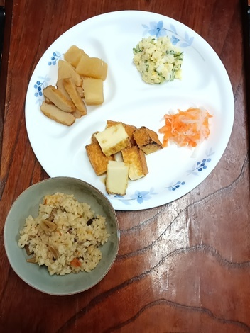 厚揚げ焼き、大根・さつま揚げ煮、サラダ、酢の物