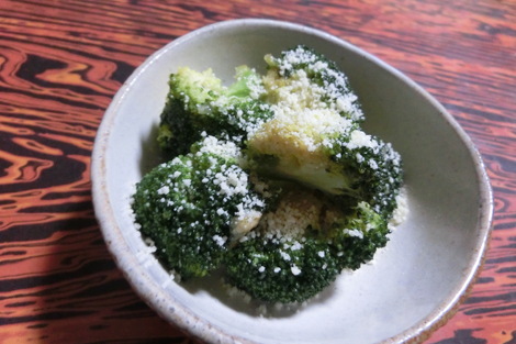 茹でたブロッコリーをフライパンでさっと炒め、最後に粉チーズをかけるだけです。