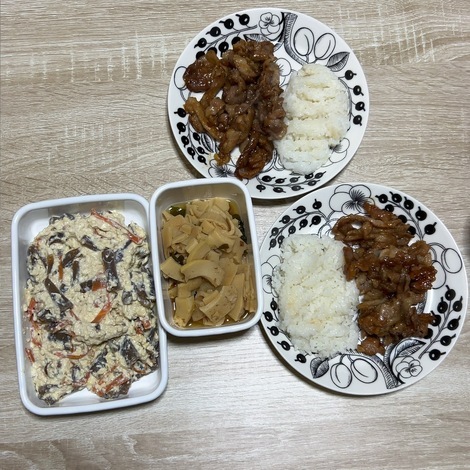 夕ご飯は豚の生姜焼き、しらあえ、若竹煮