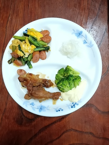 手羽元の照焼き、小松菜・ウインナー・玉子炒め、サラダ、酢の物