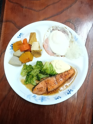 銀鮭のバター焼き、南瓜・人参・里芋・厚揚げ煮、ハム・玉子焼き、サラダ、酢の物