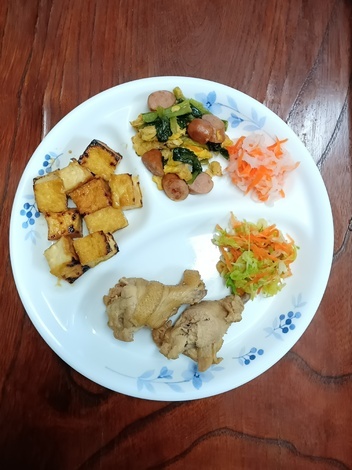 手羽元煮、厚揚げのマヨネーズ焼き、小松菜・ウインナー・玉子炒め、コールスロー、酢の物