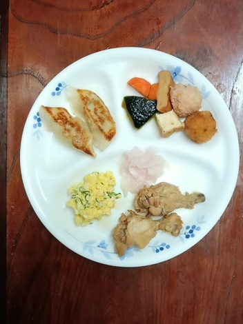 手羽元煮、餃子、南瓜・人参・揚げ物煮、サラダ、酢の物