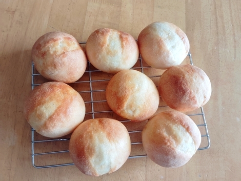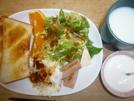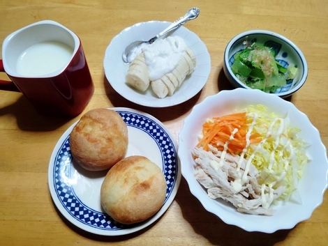 プチフランス、サラダ、蒸し鶏、ゆで小松菜、バナナヨーグルト、ホットミルク