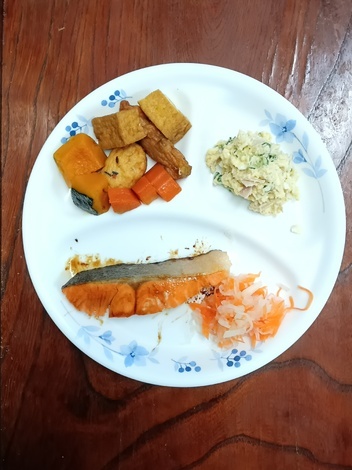 銀鮭の和風焼き、南瓜・人参・揚げ物煮、サラダ、酢の物