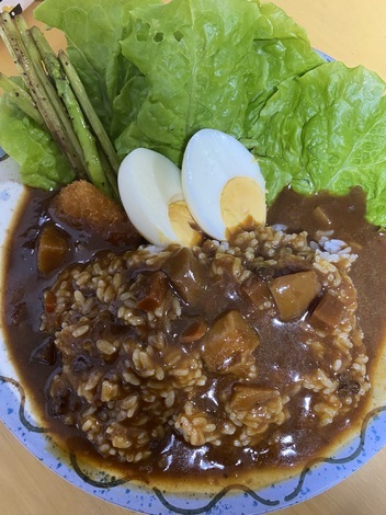 レトルトカレー使い、レタスやアスパラも一緒にのせました。