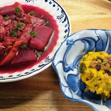 晩ごはんに南瓜サラダと、差し入れのボルシチを食べました♪(^^)