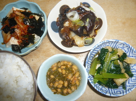 めかぶ納豆、小松菜油揚げ煮びたし、キムチ豆腐、茄子玉ねぎみそ炒め、ご飯