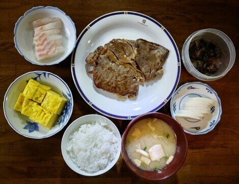 ステーキ、鯛の刺身、たまご焼きなどを食べました