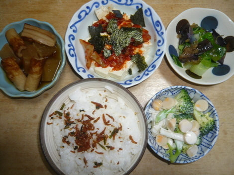■今日のおうちごはんは何?写真があればぜひシェアしてね!竹輪大根、キムチ豆腐、茄子キャベツの生姜炒め、ブロッコリー大根の皮チーカマのサラダ、じゃこご飯