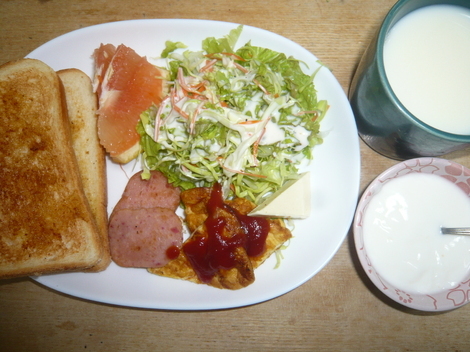 ■今日のおうちごはんは何?写真があればぜひシェアしてね!今日の朝食はグレープフルーツ、サラダ、チーズ、ハムソテー、卵焼き、トースト、ヨーグルト、ミルク