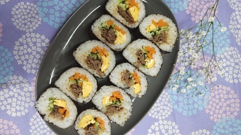中身は卵焼き、高野豆腐、でんぶ、しいたけ、きゅうり、かんぴょうと母が作っていた太巻き寿司の具材です。