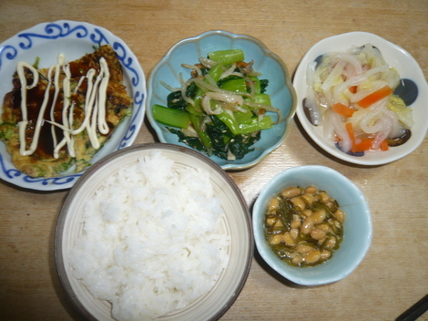小松菜竹輪のナムル、白菜人参の酢の物、キャベツハムのお好み焼き、めかぶ納豆、ご飯