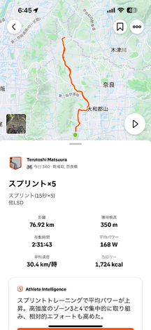 前半はスプリントを5本入れて、残りは低強度で走る内容です。