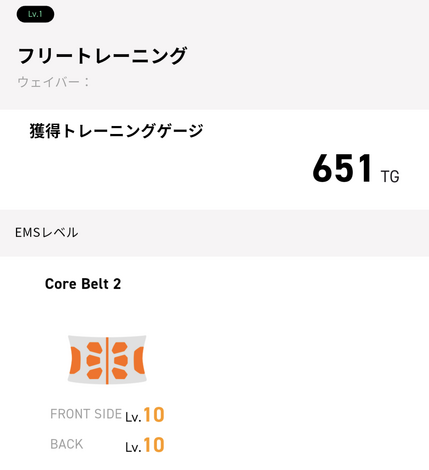 コアベルト2を、エアロバイクを漕ぎながらlv.10で使用しました。これまで全く運動しておらず大変だらしない体型でして、これくらいの負荷が丁度いいかな、と思っています。終わる頃には滝のような汗だったので。