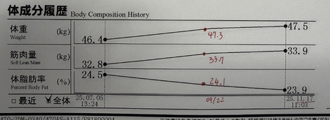 前回9/22の分が何故かグラフ上に記録されていなかったので、店員さんが手書きで書いてくれました(笑)。筋肉量が少しアップしていて嬉しいです。
