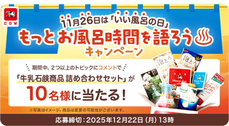 期間中に、「牛乳石鹸 お風呂部」で実施している【オーナーからのテーマ2つ以上】にコメントを投稿してください。
