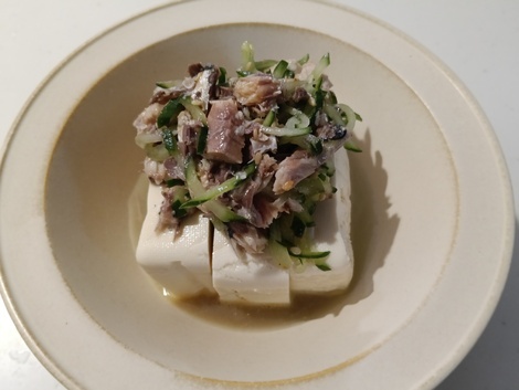 ランチ残りのきゅうりナムルにサバ缶を加えて、冷奴のトッピングにしました(^^)