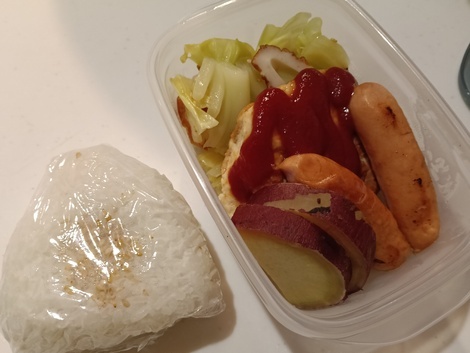 夕飯の残り物をタッパーに詰めて、お弁当にしました(^^)