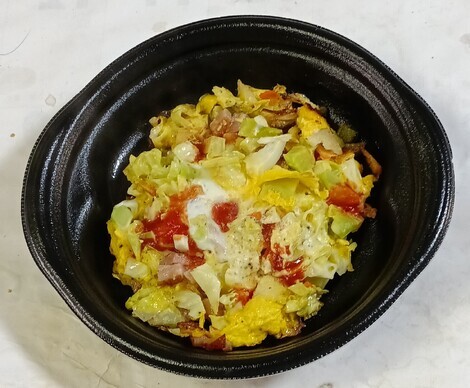 ブロッコリーの茎の部分キャベツの茎の部分を使ってベーコンのクズとに一緒に卵でとじました。