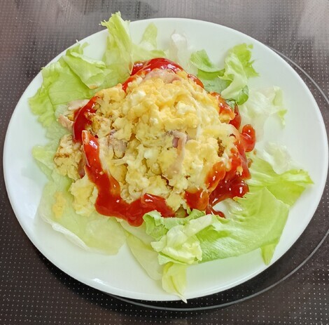 カルボナーラで卵の黄身を使ったので残った白身をオムレツにしました。オムレツにはカルボナーラでつかったベーコンとタマネギをくわえました
