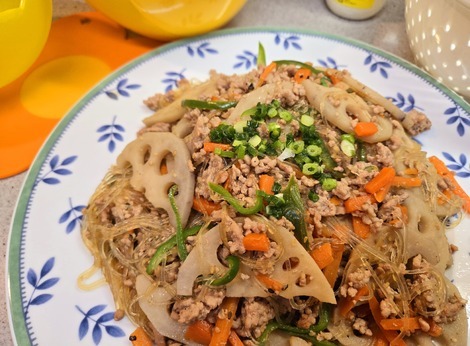 朝かられんこんとひき肉のチャプチェで元気をチャージです🐭🎈