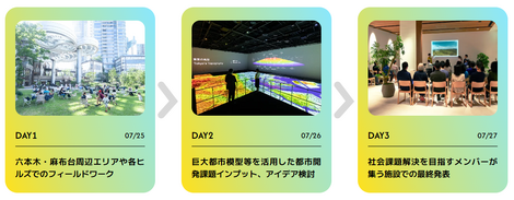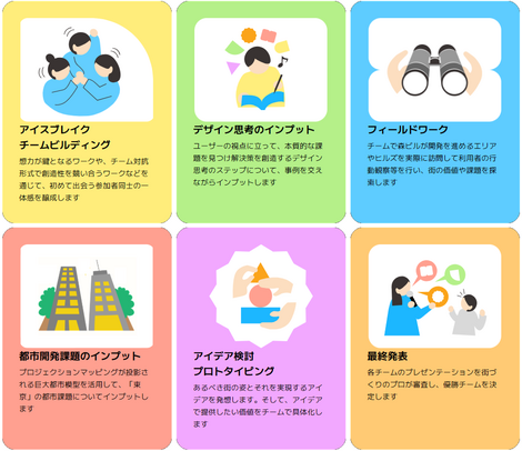 次世代を担う中高生が、都市を舞台にした探究活動を通じて「街の未来」を考えるプログラムです。夏休みの期間の3日間の通い形式で、フィールドワークやデザイン思考を活用したアイデア創出、チームごとのプレゼンテーションを行い、最終日には最優秀賞を決定します!