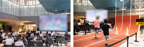 大会の熱気をそのまま伝える200インチの大画面パブリックビューイングで全95プログラムを生中継し、その横には子どもから大人まで楽しめる体験型コンテンツとして実際の陸上トラックを設置。