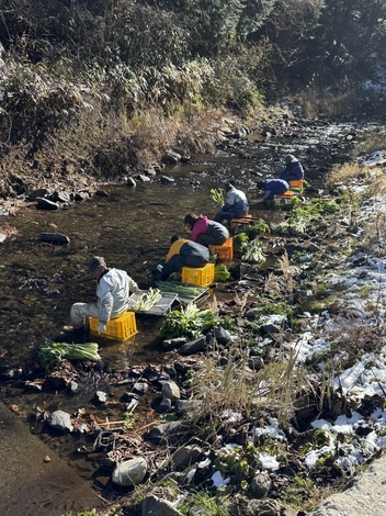 写真は昨日の日本昔話の様な川でどんぶらこのお菜洗いの様子です。