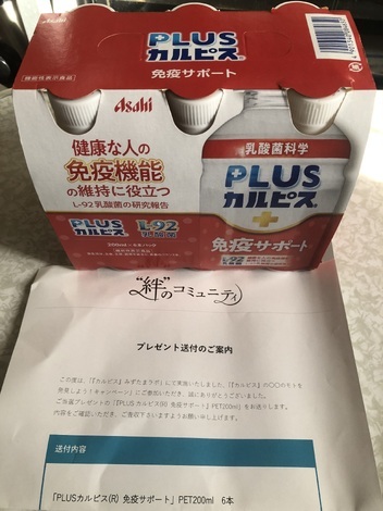 本日「PLUSカルピス(R)免疫サポ-トPET200ml 6本届きました。