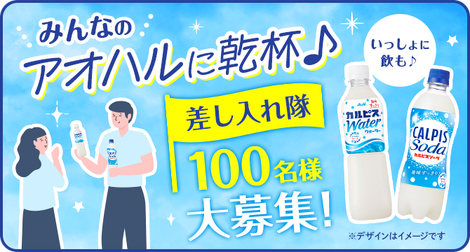 今回は、アオハルしている方に「カルピスウォーター」と「カルピスソーダ」を差し入れして、乾杯&いっしょに飲んでいただく“差し入れ隊”を100名様募集します!