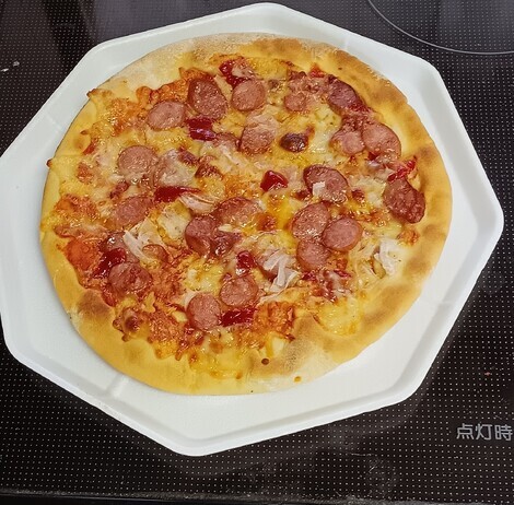 休日のブランチはピザです。市販の物にタマネギやシャウエッセン、チーズを加えてボリュームを増しています