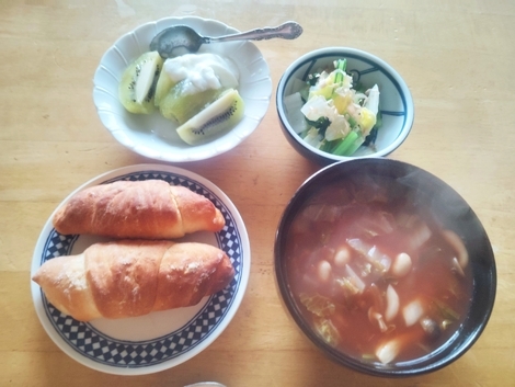 塩パン、大豆のトマトスープ、茹で小松菜、キウイフルーツ&ヨーグルト